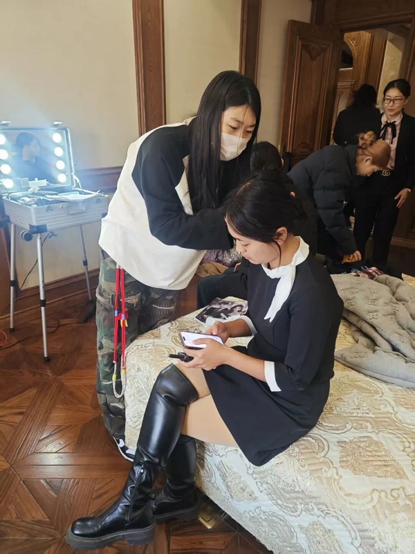 镜头转向剧组化妆间,统丽学子正全神贯注地为演员打造造型: