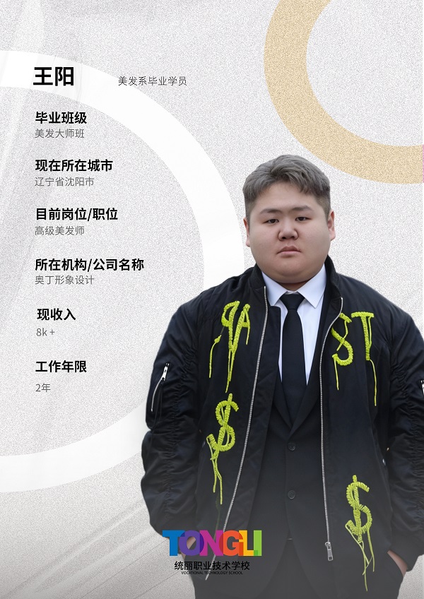 王阳从美发大师班毕业后,入职沈阳奥丁形象设计担任高级美发师,工作2年月收入就达到8k+,一步步成长为门店的核心技术骨干。