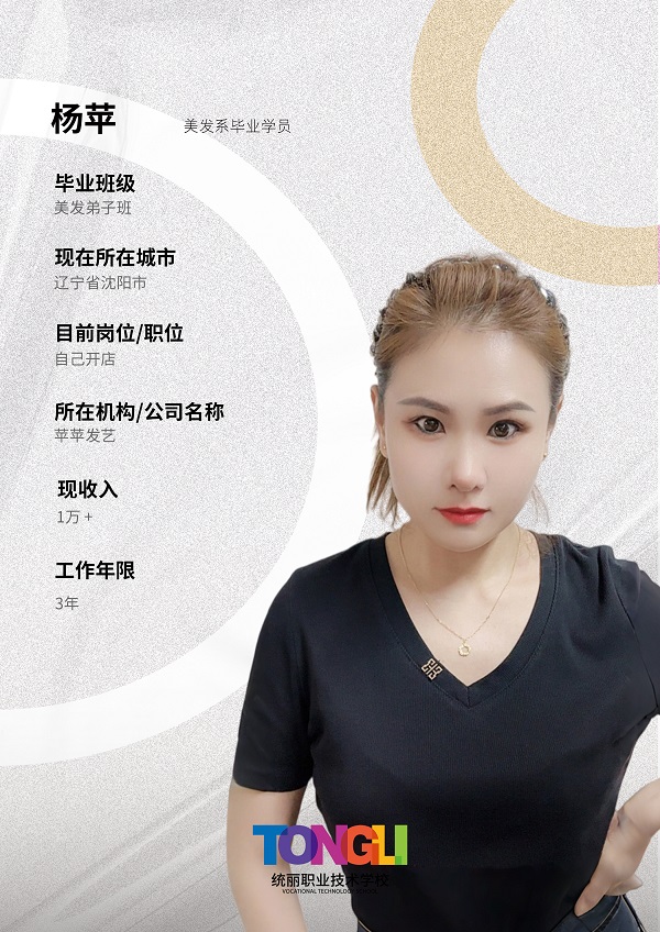 杨苹同样毕业于美发弟子班,毕业后自主创业开设了“苹苹发艺”,工作3年月收入稳定1万+,真正实现了自己的开店创业梦想。