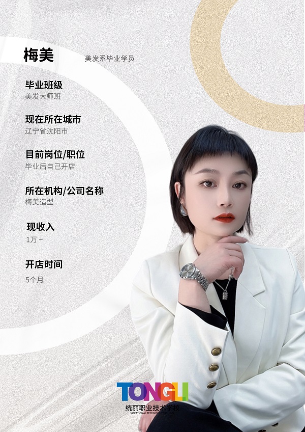 同样毕业于美发大师班的梅美,在沈阳创办了“梅美造型”,开店5个月月收入就稳定在1万+,靠专业的技术和贴心的服务,在竞争激烈的沈阳美发市场站稳了脚跟。