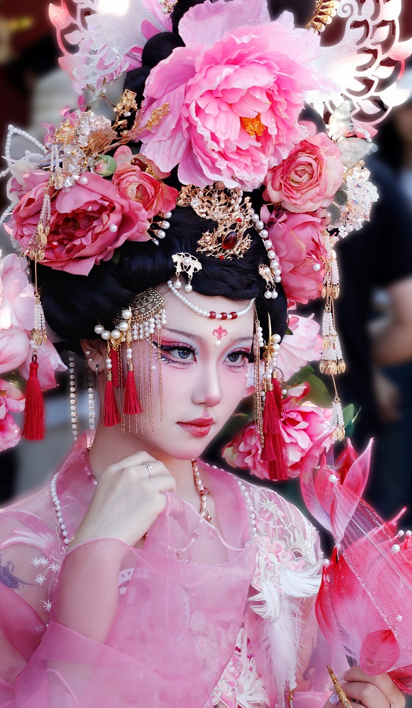 整体搭配更是 “锦上添花”,额头中央的红色花钿的点缀,既强化了古风辨识度,又与唇色、眼尾深粉形成色彩呼应。头上的大朵粉色牡丹、金色饰件与珍珠流苏步摇,搭配粉色薄纱服饰,让妆容、头饰与服装色调统一,构成和谐的整体,将古典美人的艳丽与精致展现得淋漓尽致。