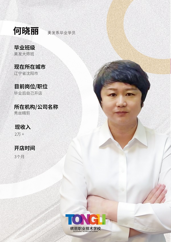 何晓丽是统丽美发大师班的毕业学员,毕业后在沈阳自主创业,开设了自己的门店“秀丝精剪”。仅仅开店3个月,她的月收入就稳定达到2万+,用在学校学到的扎实技术,快速在沈阳本地打开了市场,积累了一批忠实客源。