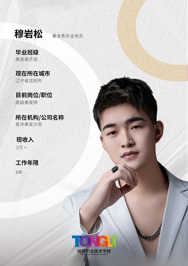 穆岩松毕业于统丽美发弟子班,如今任职于沈阳易沐美发沙龙,担任高级美发师,从业8年月收入更是突破3万+,成为沈阳美发行业的资深大咖。